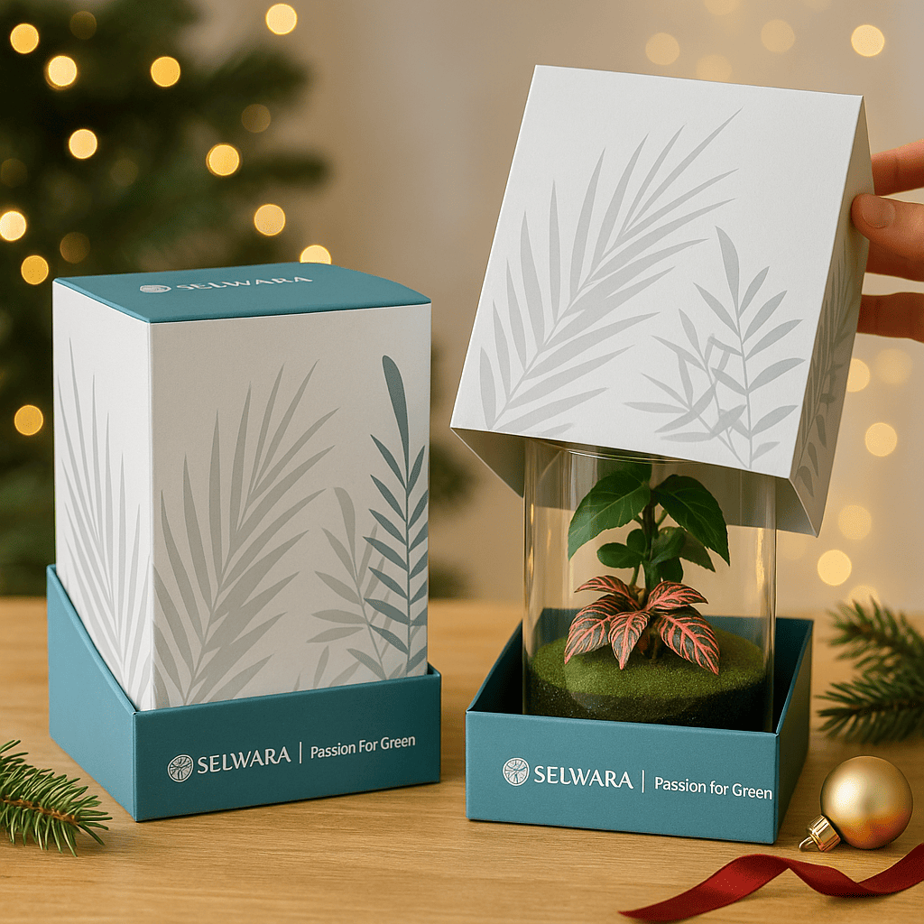 Esta exclusiva caja convierte cada terrario en el detalle perfecto para estas fiestas. Elegante, práctica y diseñada para sorprender.