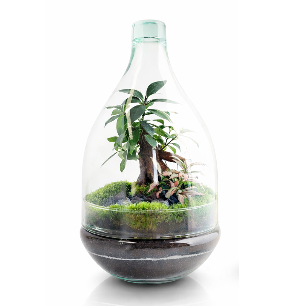 El terrario de cristal Darién combina diseño y naturaleza en un formato compacto. Este modelo incluye un ficus ginseng como planta principal, acompañado de una fittonia, musgo, piedras decorativas y un sustrato especial, creando un elegante jardín en un bol. Elaborado de manera artesanal, es perfecto para transformar cualquier espacio con estilo y frescura.