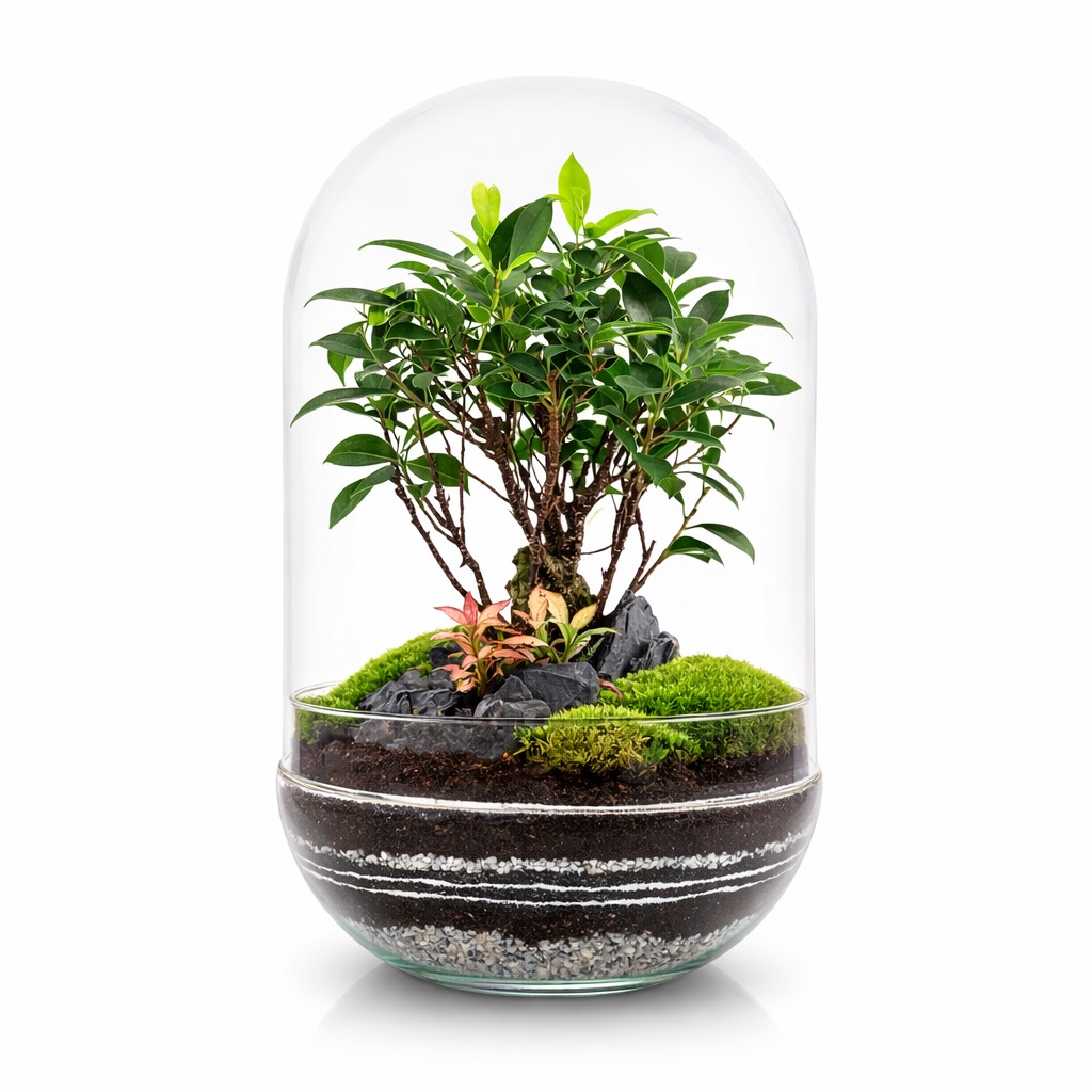 Este terrario contiene un FICUS RETUSA 5 años como planta principal, musgo, grava, piedras decorativas y sustrato especial. Se envía totalmente elaborado de manera única por nuestros artesanos junto con una guía de cuidados.